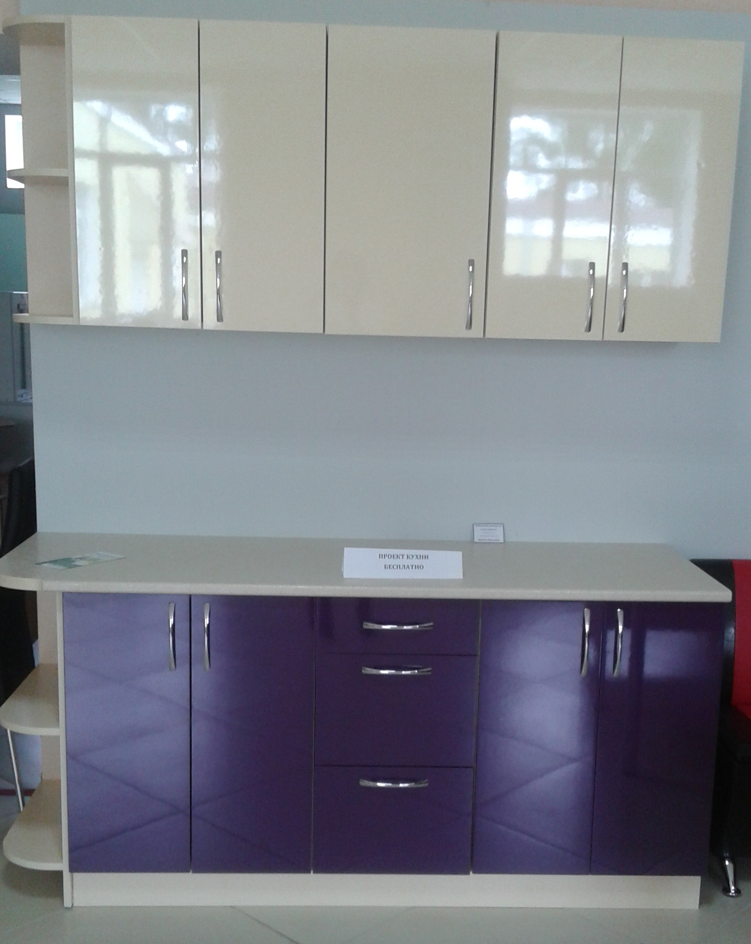 Небольшая линейная кухня из пластика. Стильные глянцевые фасады. Светлый тон навесных шкафчиков отлично смотриться с приятным фиолетовым цветом рабочего стола.
