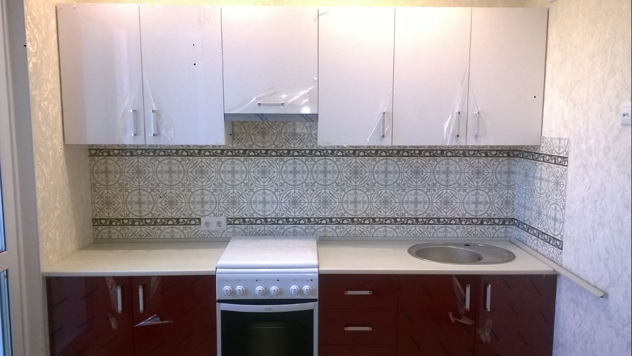 Стильная современная кухня из пластика. Глянцевые бардовые фасады рабочего стола в сочетании белых шкафчиков выглядят очень элегантно.