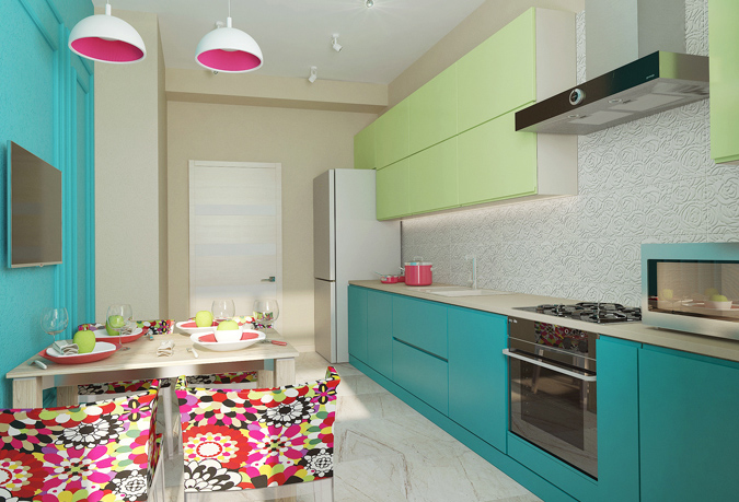 Линейная кухня выполнена в яркой современной расцветке. Фасады подвесных шкафчиков исполнены в фисташковом цвете, а напольных тумб в насыщенном бирюзовом. Фасады лишены привычных ручек и открываются благодаря небольшим углублениям на торцах.