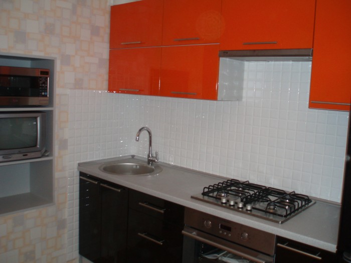 Кухня «Black&Orange» имеет довольно компактные размеры, позволяющие разместить ее даже в самых малогабаритных помещениях. Глянцевые фасады выполнены в черном и оранжевом цветах, которые придают кухне свой определенный стиль.
