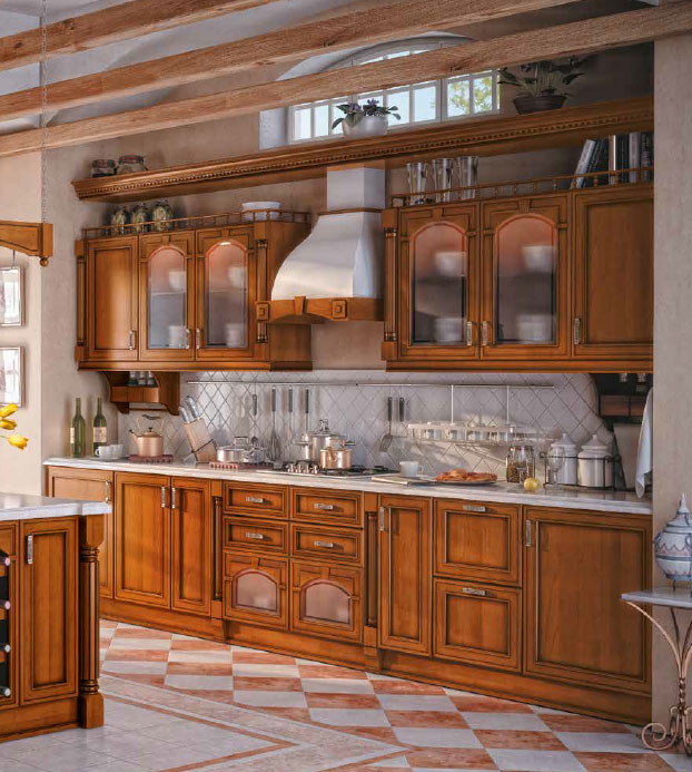 Данная модель кухни представляет собой современный шедевр итальянской классики, который сочетает в себе одновременно всю роскошь изящных линий и дорогого дерева, а также простоту духа, и создаваемой атмосферы. Фасад кухни выполнен в очень приятном ореховом цвете с древесной текстурой, створки декорированы вставными филенками и вставками из стекла.