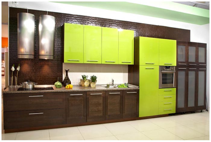Линейная кухня поразит вас своим уникальным дизайном. Фасады окрашены в салатовый и темно-кофейный оттенок. Скинали исполнены в тон нижних фасадов. Для удобства в работе гарнитур оснащен подсветкой.