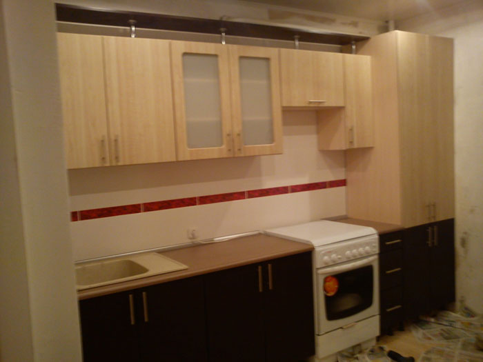 Компактный набор кухонного гарнитура, который идеально подойдет в небольшие помещения. Комбинированный цвет фасадов создаст неповторимый стиль для вашей кухни. Нижние фасады окрашены в черный цвет, верхние – в светло-земляной.