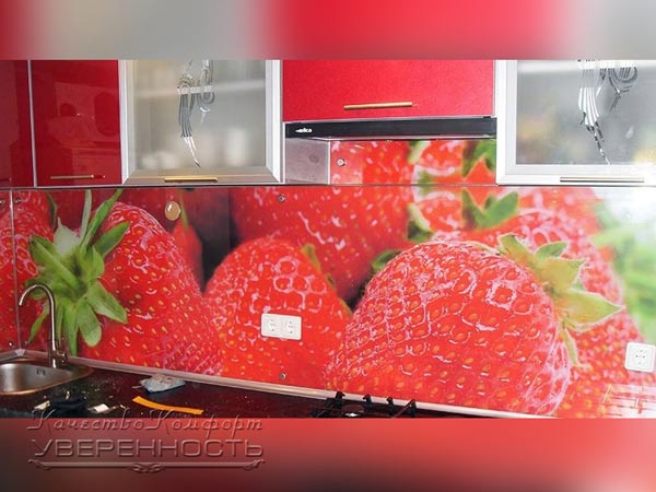 Фасады линейного гарнитура окрашены в красный цвет. Главная особенность кухни – стеклянные скинали с декоративной фотопечатью, изображающую клубнику. Гарнитур окажет возбуждающее действие на аппетит человека, подарит яркую атмосферу.