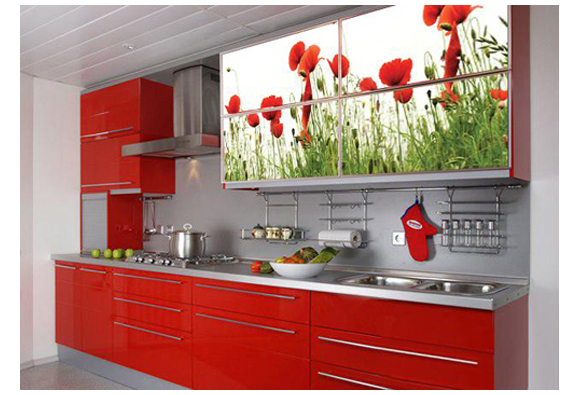 Красная глянцевая кухня имеет небольшую линейную конструкцию. Фасады верхних шкафов декорированы яркой фотопечатью с изображением маков. Просторные шкафы и выдвижные ящики комплектуются удобными широкими ручками, выполненными из металла. Строгий лаконичный дизайн – отличительная особенность представленной модели.