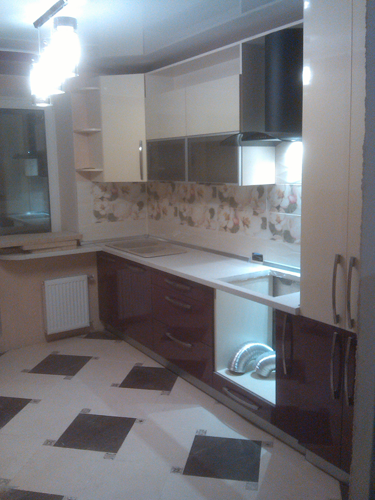 Модель линейной кухни выполнена в двух цветах: белом и красном, что делает ее одновременно яркой и настраивающей на хороший аппетит, и в то же время легкой и с ненавязчивым фоном. Кухня декорирована дополнительной подсветкой над рабочей частью столешницы и плиты, что по достоинству ценит любая хозяйка. Ручки дугообразные, хромированные.