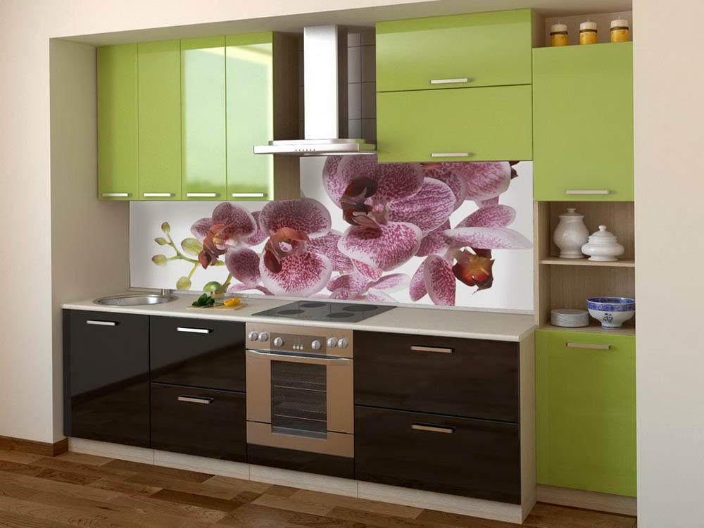 код 68602Цвет: лайм, венге. Глянцевые фасады. Фартук с фотопечатью.
