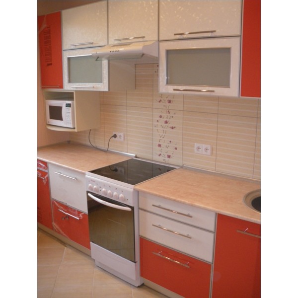 Кухня комплектована металлической фурнитурой. Верхние шкафчики, расположенные по краям - оранжевые, а те, что в середине - белые со стеклянными дверцами. Отличная функциональная модель веселой яркой окраски никого не оставит равнодушными.