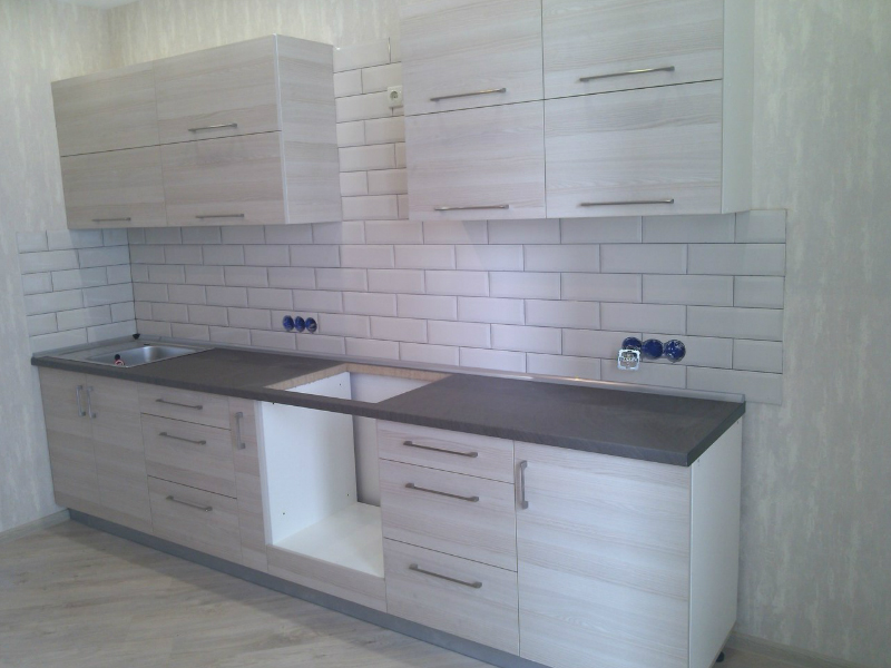 Линейная кухня «Песок» получила свое название за счет необычного цвета фасадов. Материалом изготовления служит высококачественное ЛДСП Egger. Ящики комплектуются современной фурнитурой, открываются бесшумно и плавно.
