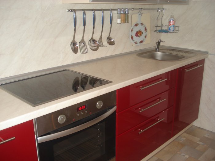 Кухня «Red» характеризуется как прямая, благодаря чему она как нельзя лучше подходит для небольших помещений. Дизайн кухни выполнен в единой концепции и сочетает в себе красные и бежевые фасады. Материал фасадов имеет глянцевую поверхность, что визуально сделает вашу кухню больше.