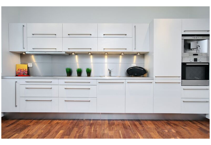 Линейная кухня привлекает своими простыми формами и лаконичным дизайном. Мебель окрашена в белый цвет, такое решение позволит создать иллюзию пространства даже в самой небольшой комнате. Особое внимание стоит обратить на длинные металлические ручки, которые украшают фасады. В модели предусмотрена подсветка рабочего стола.