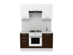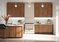 Линейная кухня выполнена из высококачественных материалов. В исполнении присутствуют исключительно прямые линии и формы, фасады окрашены в цвет венге. Строгость дизайна призваны разбавить скинали с декоративной фотопечатью.