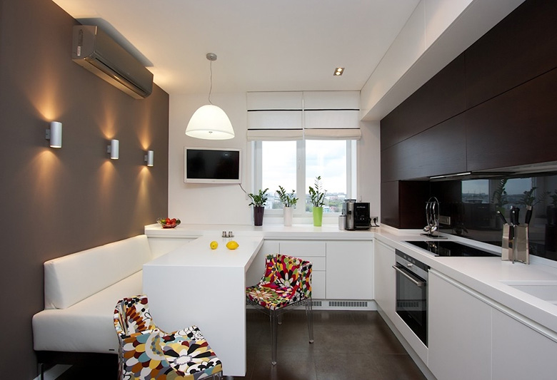 При изготовлении данной модели кухни на заказ были использованы только натуральны и высококачественные материалы. Конструкция линейная, однако имеет своеобразное продолжение на подоконнике и обеденном столе, создавая еще больше рабочей поверхности. Фасад матовый в черно-белом цвете, такое сочетание создает своеобразный и интересный 3Д-эффект.