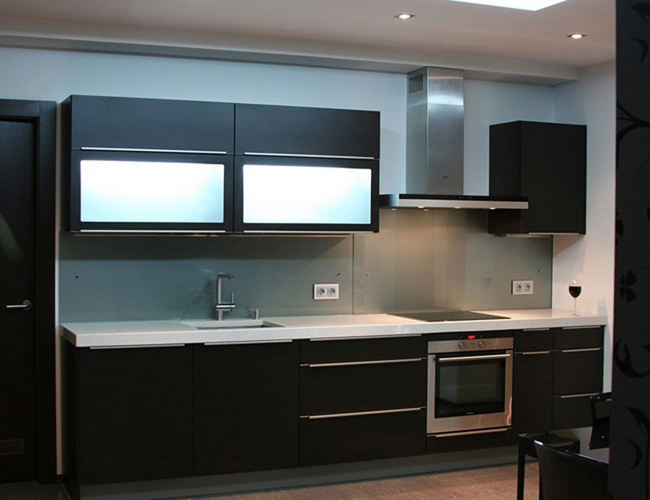 Кухня линейная темная с прочной столешницей