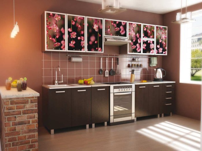 Линейная кухня выглядит нежно и романтично. Верхние и нижние фасады идеально подобраны друг к другу и составляют единую композицию. Кухня эргономична и проста в использовании. Фасады верхнего модуля декорированы цветочной фотопечатью.