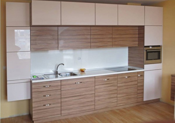 Кухня линейная в мягких тонах в двухцветном оформлении