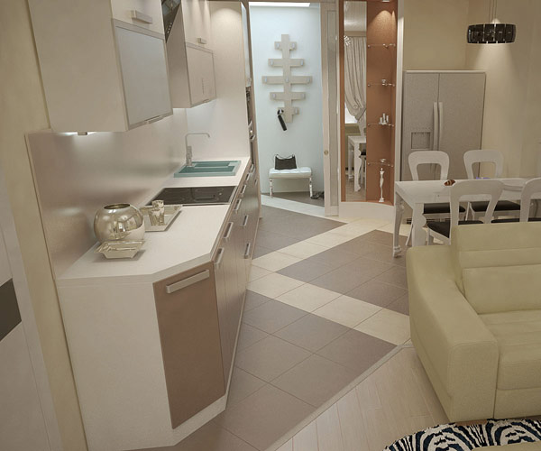 Кухня линейная в мягких тонах с подсветкой рабочей зоны