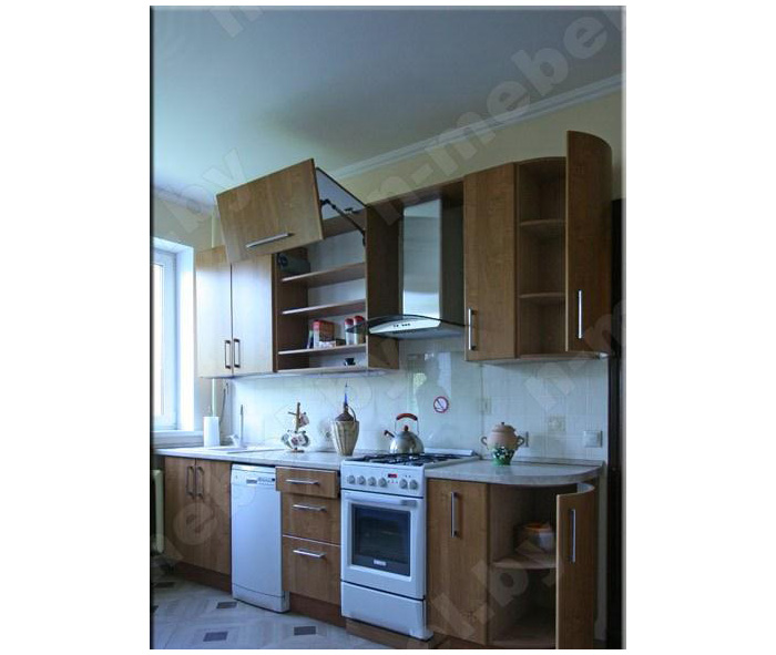 Линейная кухня, представленная в цвете натурального дерева, изготовлена из прочных и долговечных материалов. Закругленные углы делают внешний вид модели еще более интересным и оригинальным. В комплекте предусмотрены шкафчики разных размеров и выдвижные ящики для хранения кухонных принадлежностей.