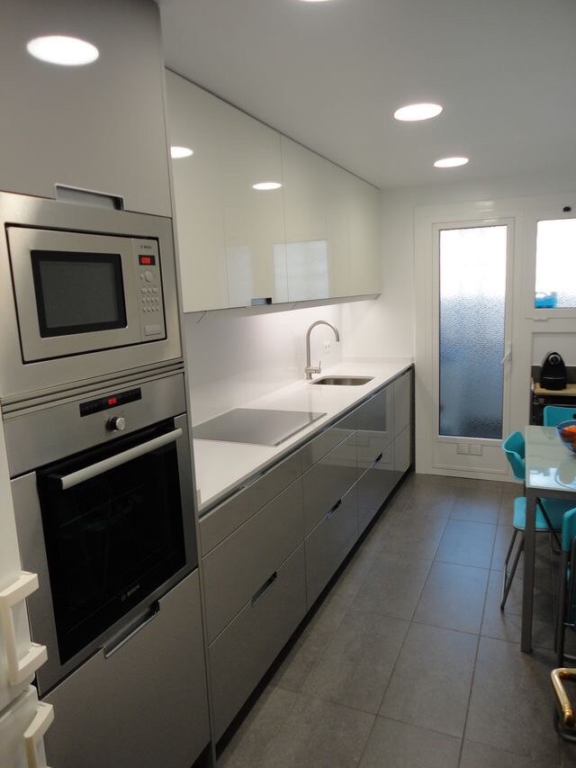 Темные и светлые фасады из пленочной МДФ. Ширина кухни 230 см.