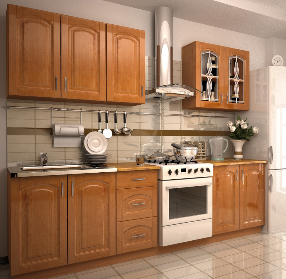 Линейная кухня выполнена в цвете натурального дерева из материалов высокого качества. Нижний ряд представлен несколькими шкафчиками с распашными створками и выдвижными ящиками. Дверцы одного из трех подвесных модулей украшают стеклянные вставки с оригинальным узором. Качественные материалы обеспечивают высокую прочность конструкции.