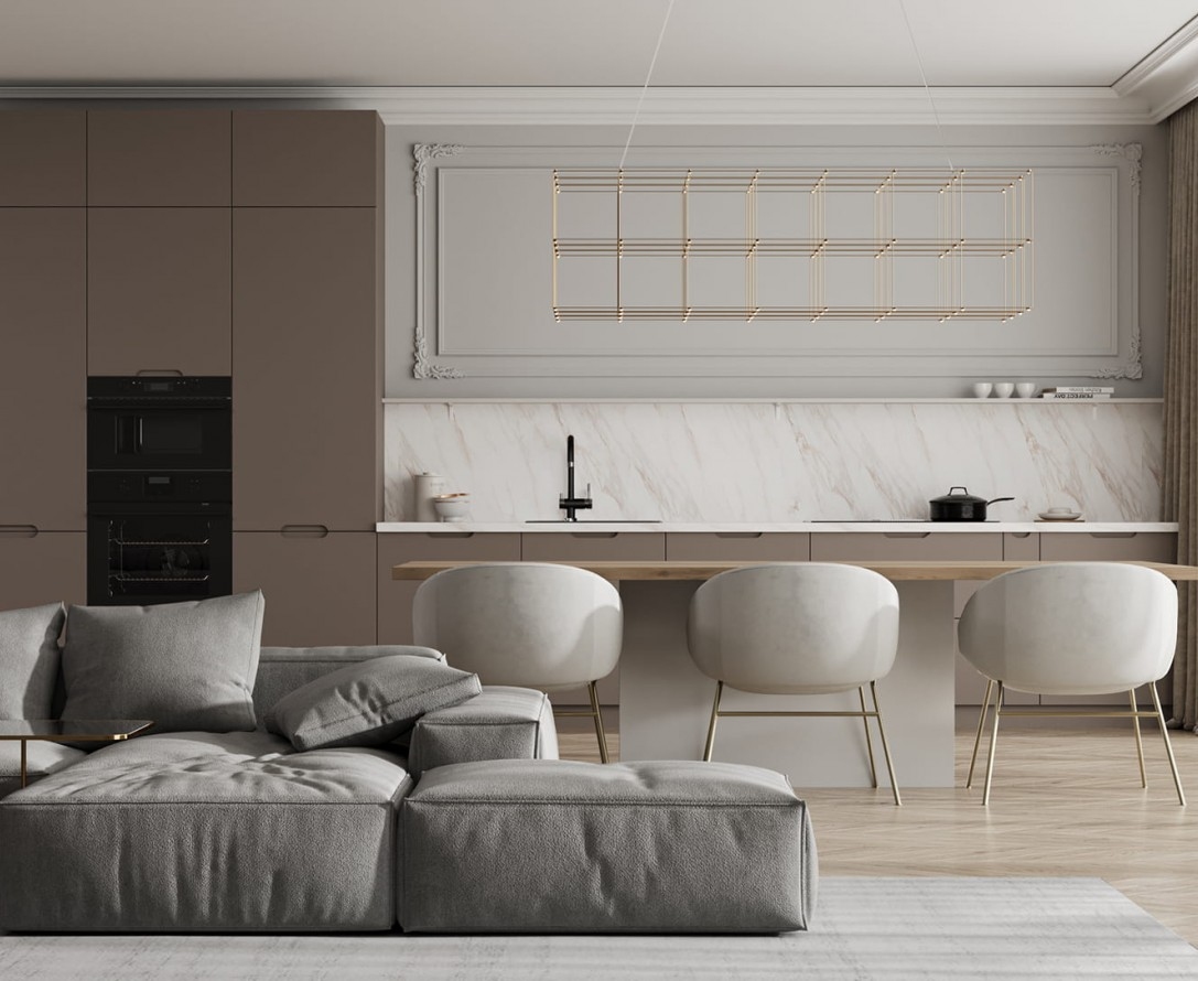 Островная кухня в стиле минимализм с матовыми фасадами без ручек из крашенного МДФ.