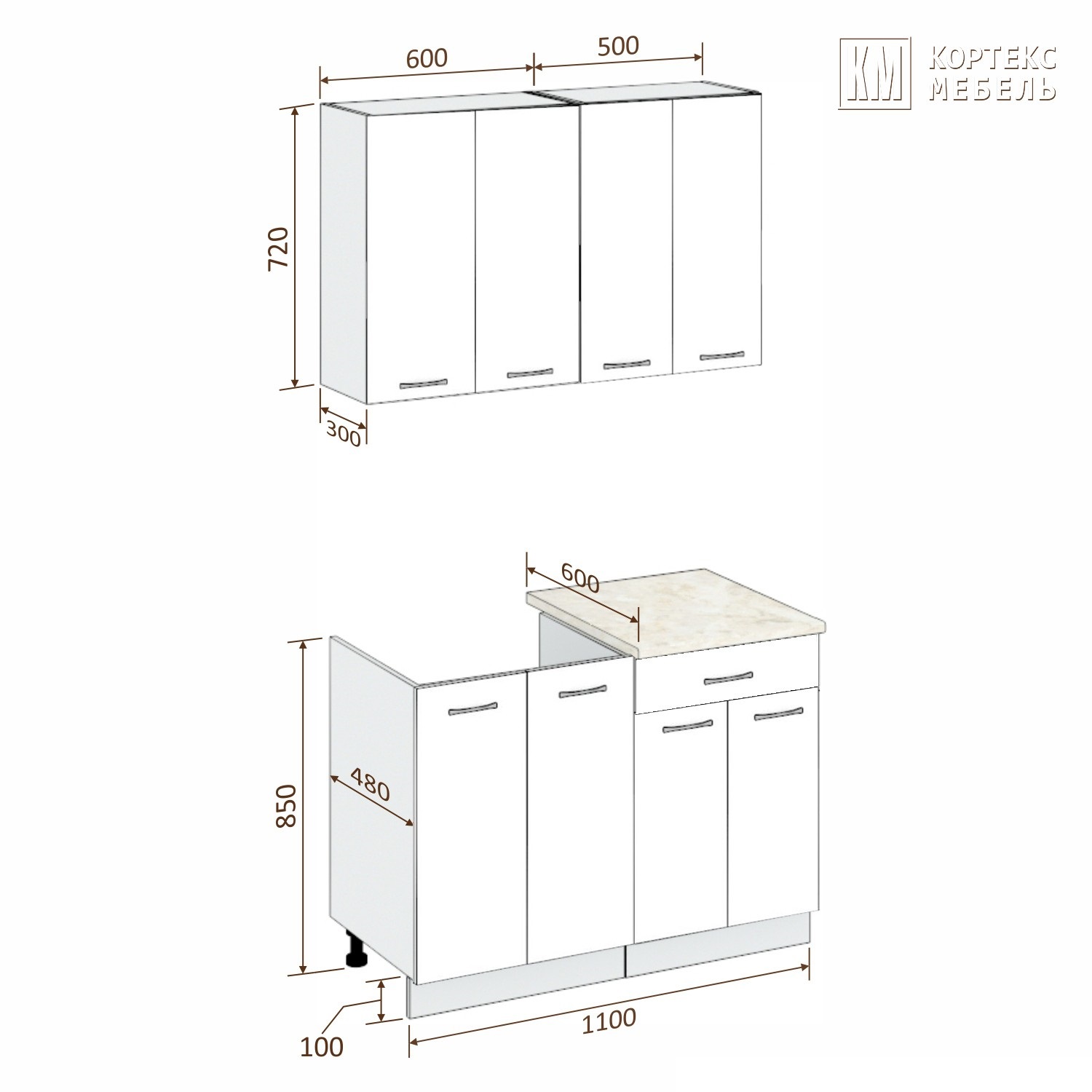 Глубина нижних шкафов, мм: 480.