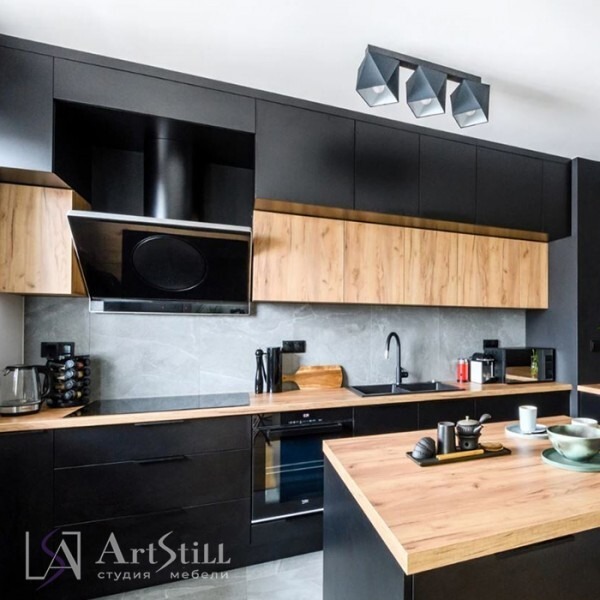 Кухня прямая с островом выполнена в «Стиле Лофт». Дизайнерская кухня на заказ соединила в себе современный и стиль лофт. Дополнительным местом для хранения являются антресоли над верхними ящиками. Темный цвет фасадов отлично сочетаются с древесной фактурой.