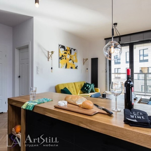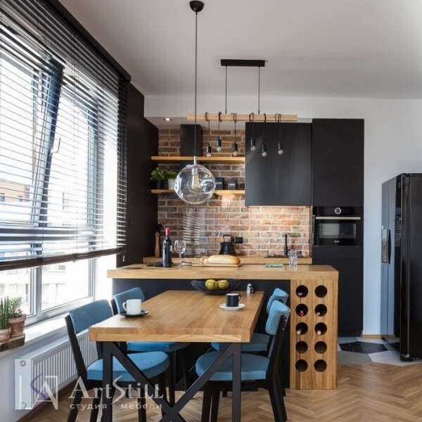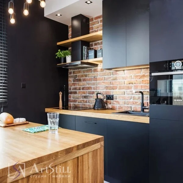 Кухня прямая с островом выполнена в «Стиле лофт». Дизайнерская кухня на заказ соединила в себе современный и стиль лофт. Маленькая кухня может быть стильной и удобной. Темный цвет фасадов отлично сочетаются с древесной фактурой.