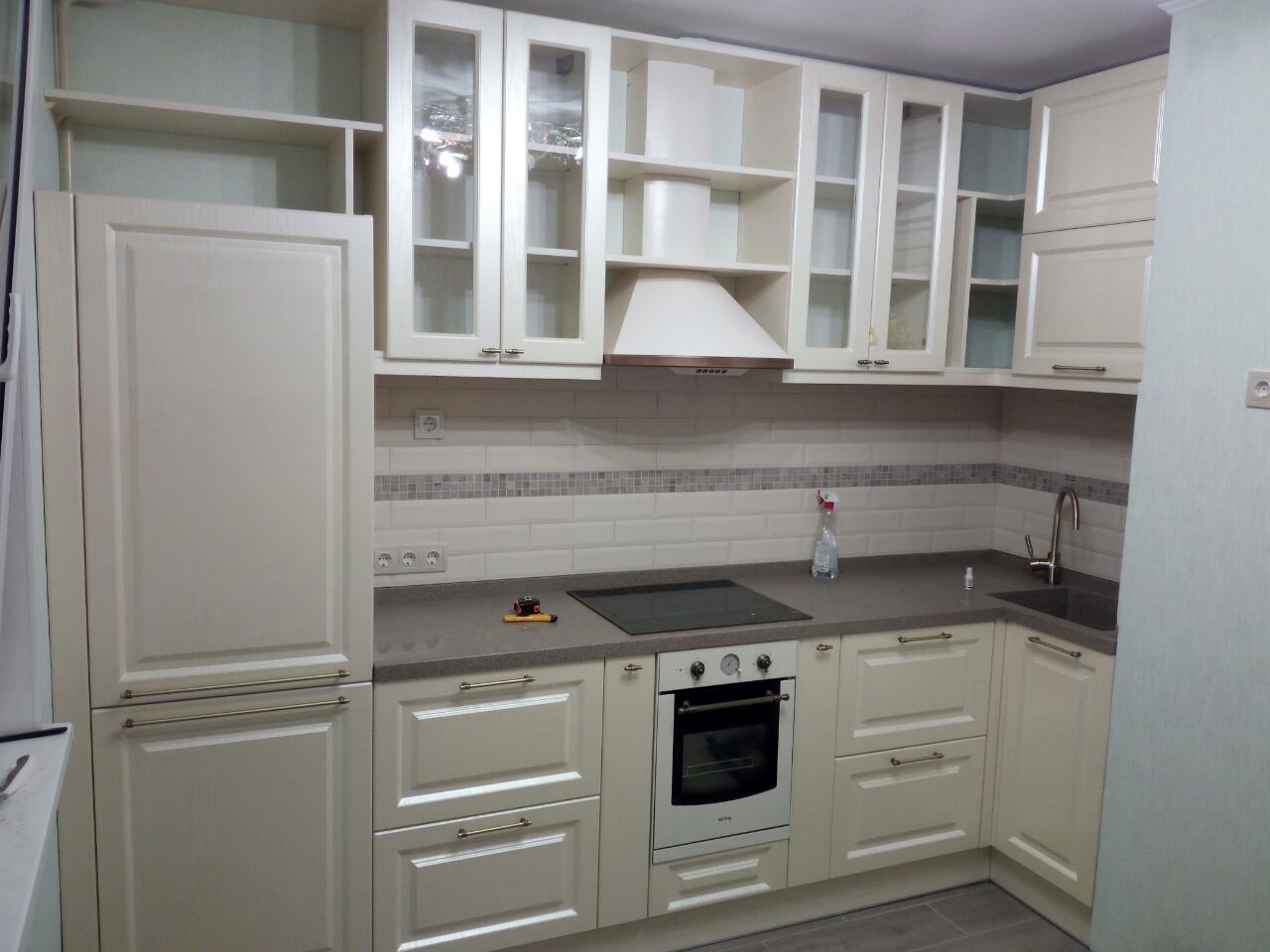 Угловая кухня с матовой поверхностью и частичным остеклением верхних шкафов.