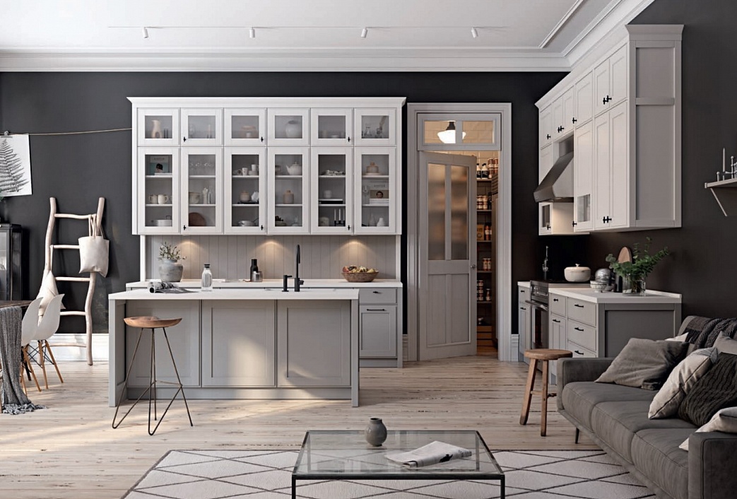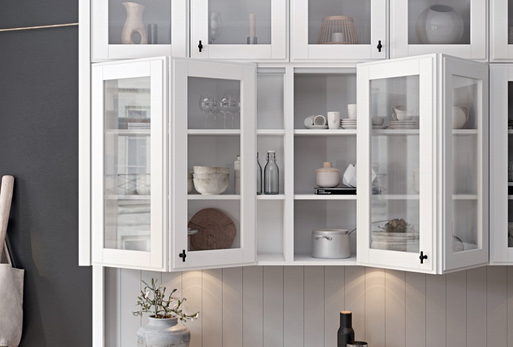 Кухонный гарнитур с модульными шкафами и открытыми полками.