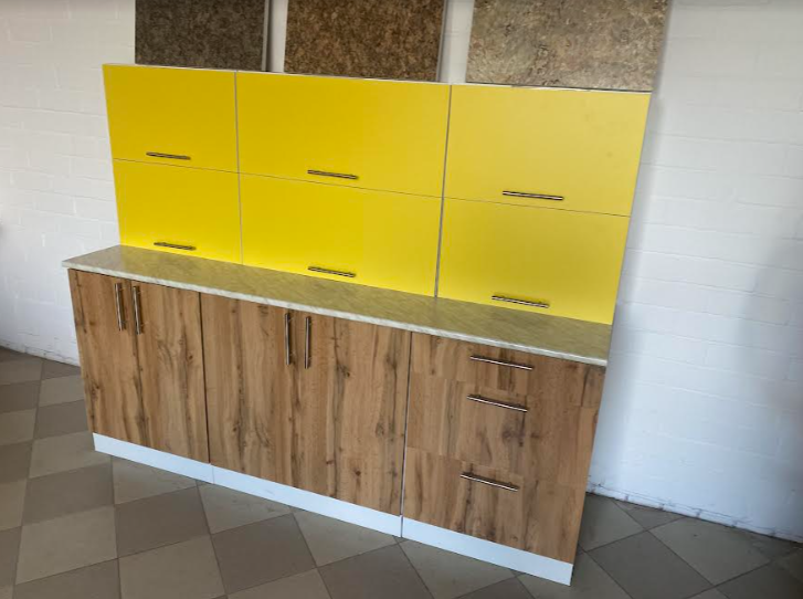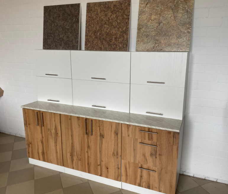 код 132719Современная линейная кухня. Разные цветовые решения фасадов и столешницы.