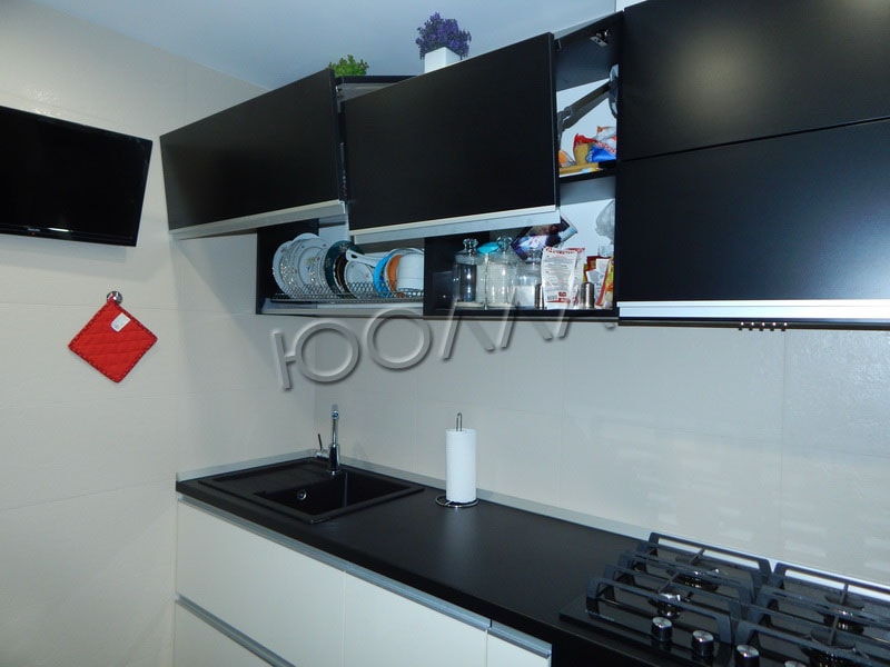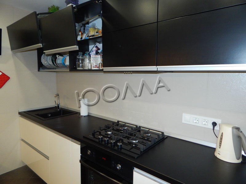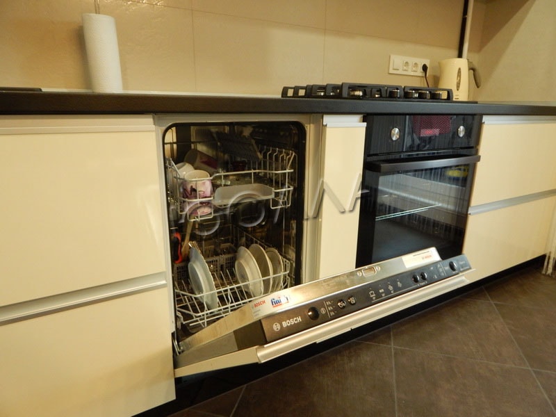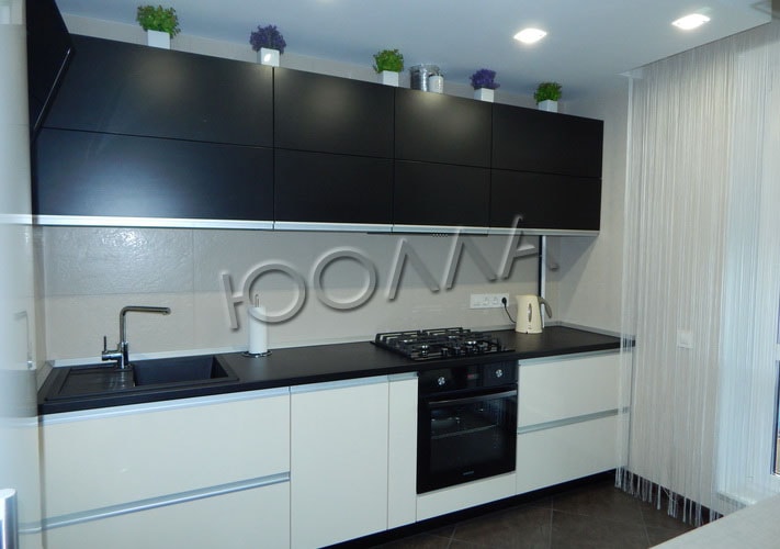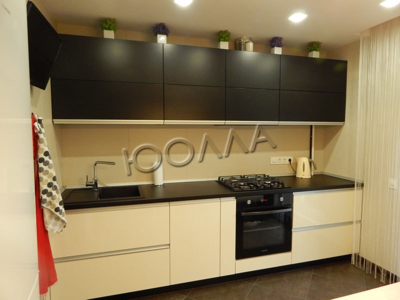 код 89715Кухня в черно-бежевых тонах с удобной качественной фурнитурой, матовые фасады с профильными ручками.