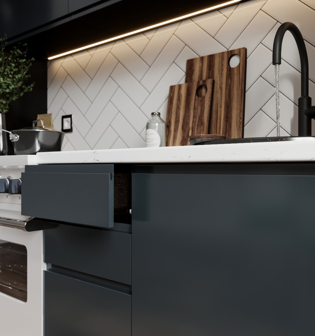 В данной линейке используются покрытые эмалью фасады МДФ 19 мм с интегрированной ручкой – фрезерованный паз в торце мебельного фасада, обеспечивающий высокий уровень эстетичности и удобство эксплуатации.