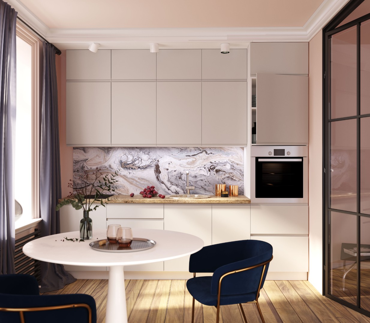 Современная кухня в скандинавском стиле. Светлые фасады из ДСП.