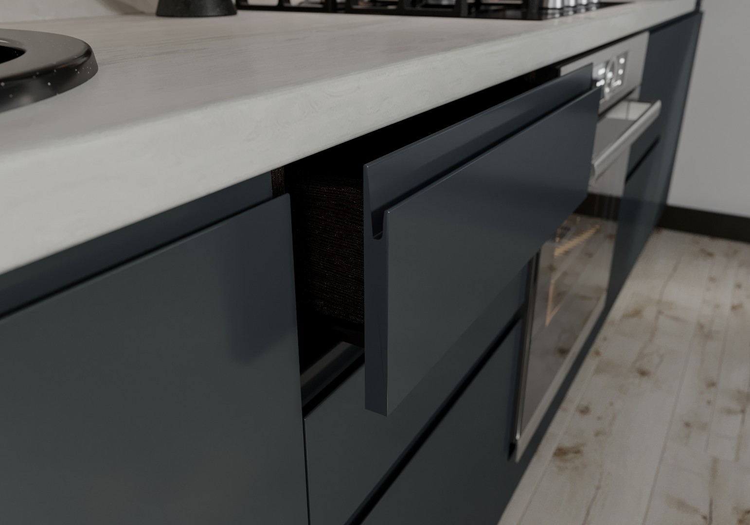 Темно-серая угловая кухня с крашеными фасадами