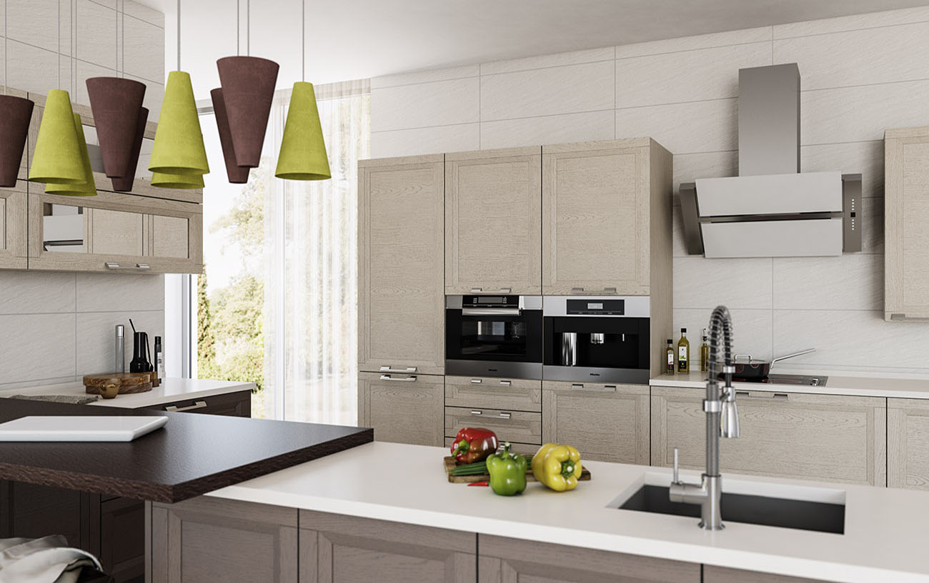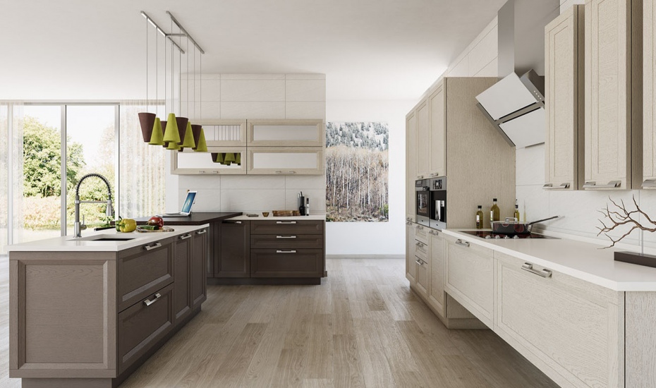 Образец оформления кухни с использованием филенчатых фасадов и стеклянных вставок.