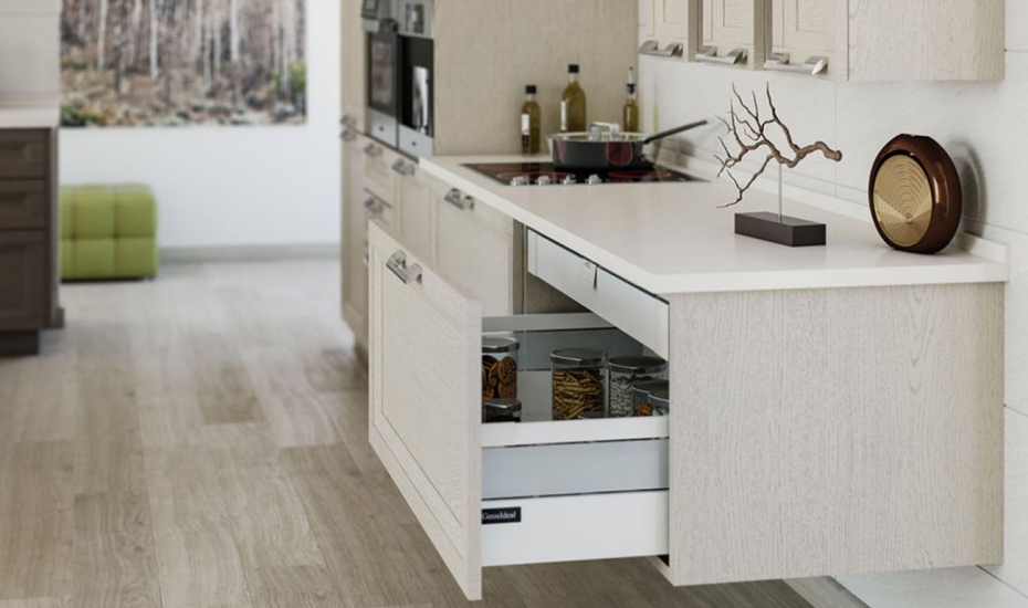 Стильные, выдержанные тона фасада из ясеня, самое современное наполнение шкафов, оригинальные навесные столы, придающие кухне лёгкость и изящество, - всё делает «Маринару» лидером среди кухонь в классе «модерн».