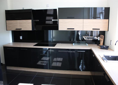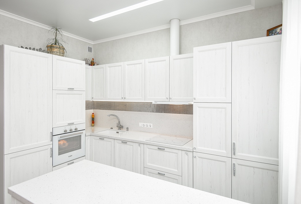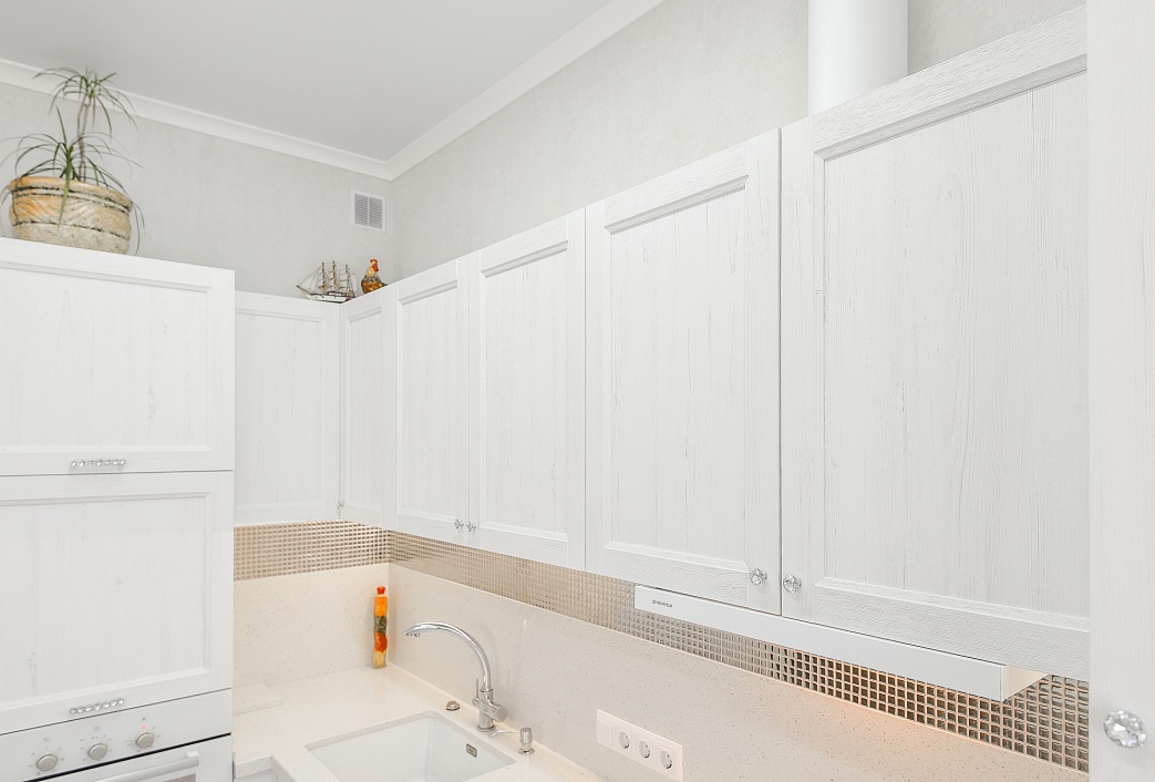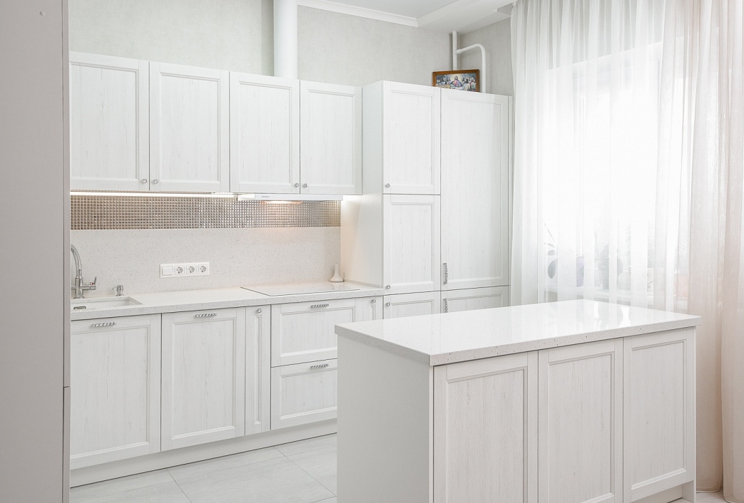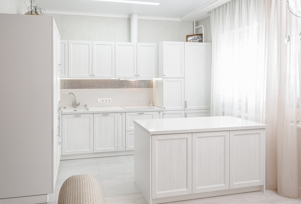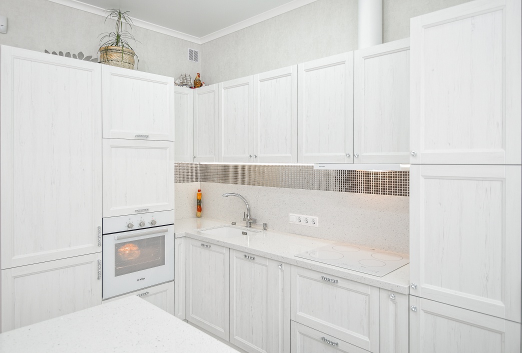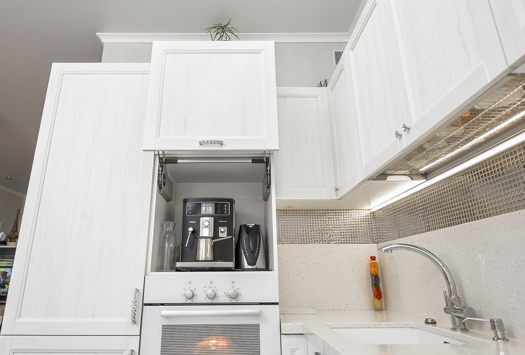 Светлые глянцевые фасады. современная и надежная фурнитура, ниши для техники.