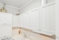 Закрытые полки, тумба с тремя выдвижными ящиками.