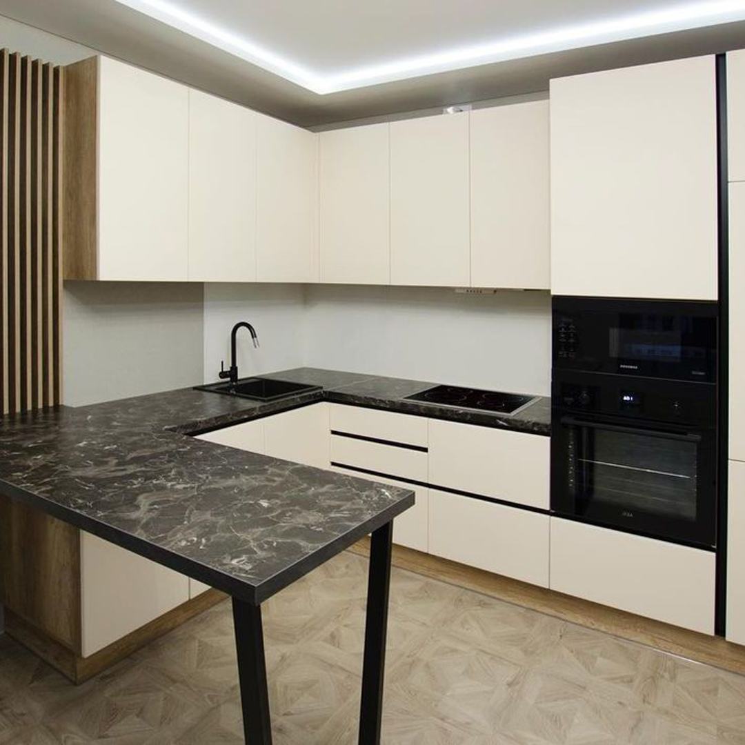 Фасады без ручек, ниши для техники, обеденная стойка.