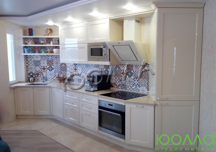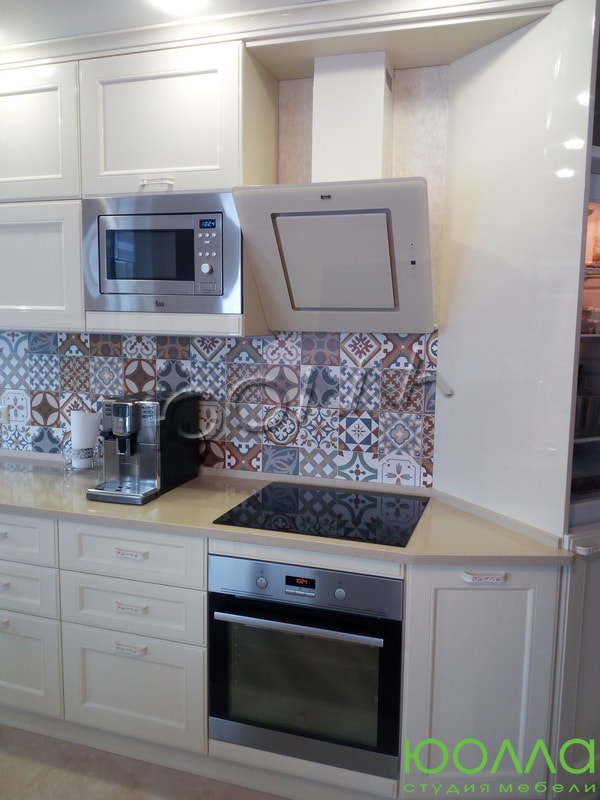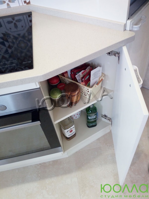 код 89634Кухонный гарнитур для помещения нестандартной планировки. Нежный бежевый цвет всегда смотрится выигрышно.
