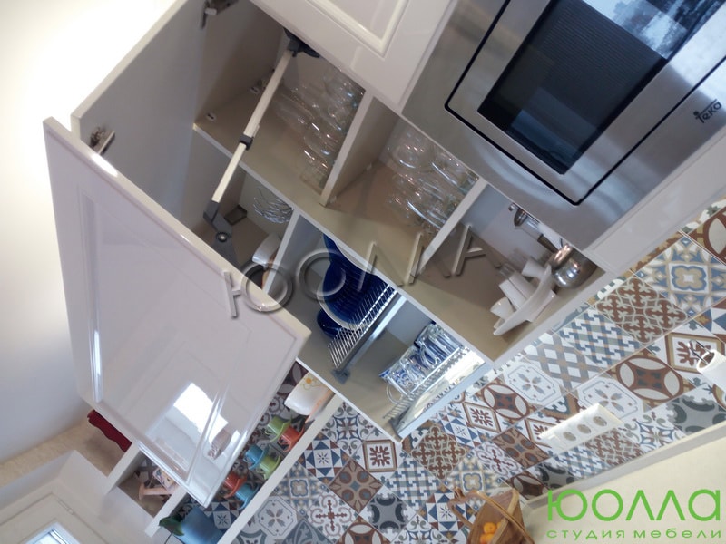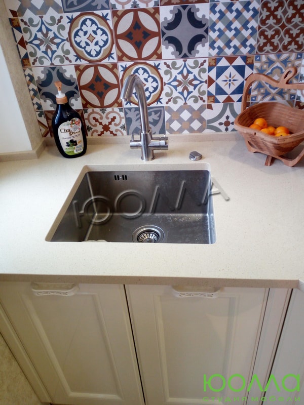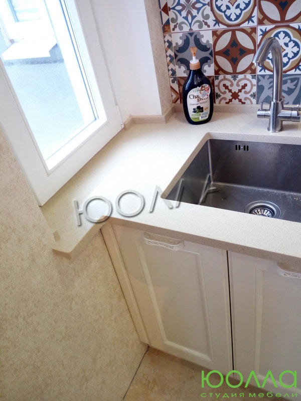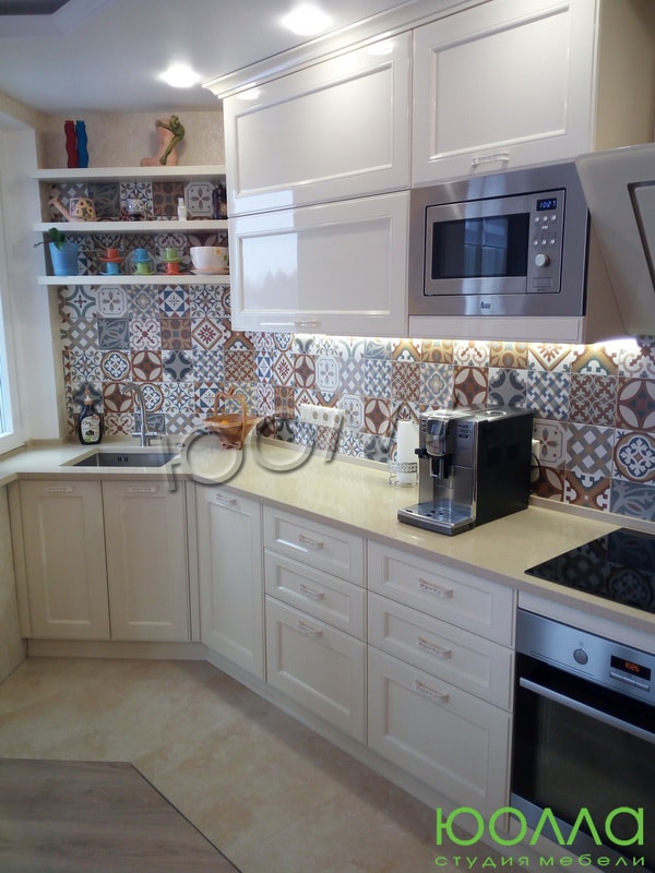 Данная вариация кухни «Мартин» адаптирована под комнату нестандартной формы. Зигзагообразная стена «изгибается» вместе с кухонным гарнитуром, поддерживая общий визуальный стиль комнаты. Столешница в данной вариации плавно переходит в подоконник. Кухня изготовлена со скрытыми креплениями и фурнитурой по немецкой технологии "Фолдинг".