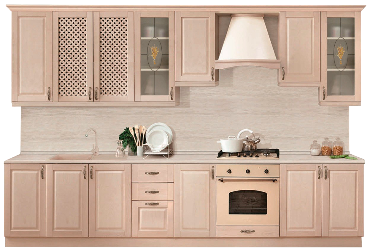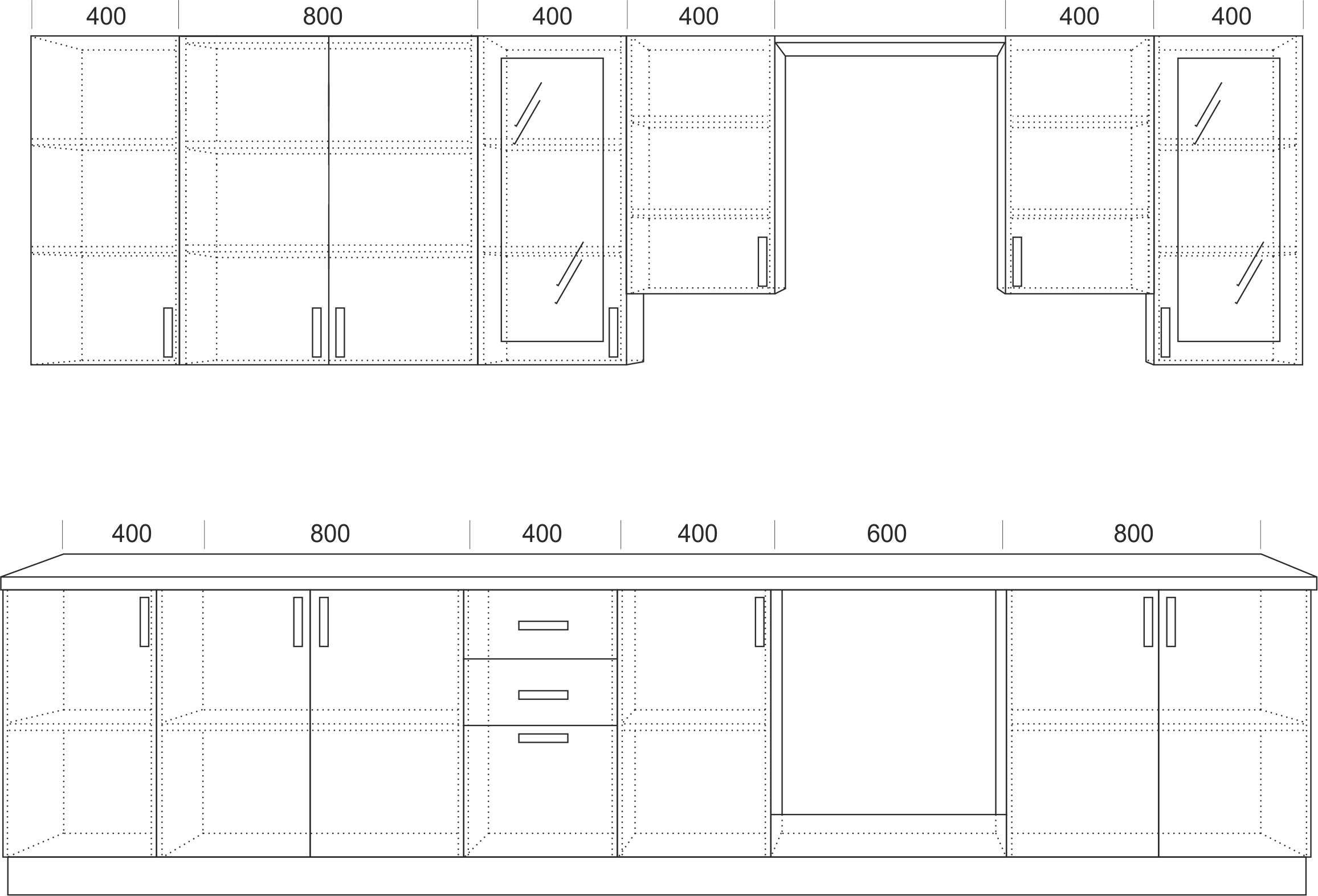 Верхние фасады со стеклом. Ширина кухни 200 см.