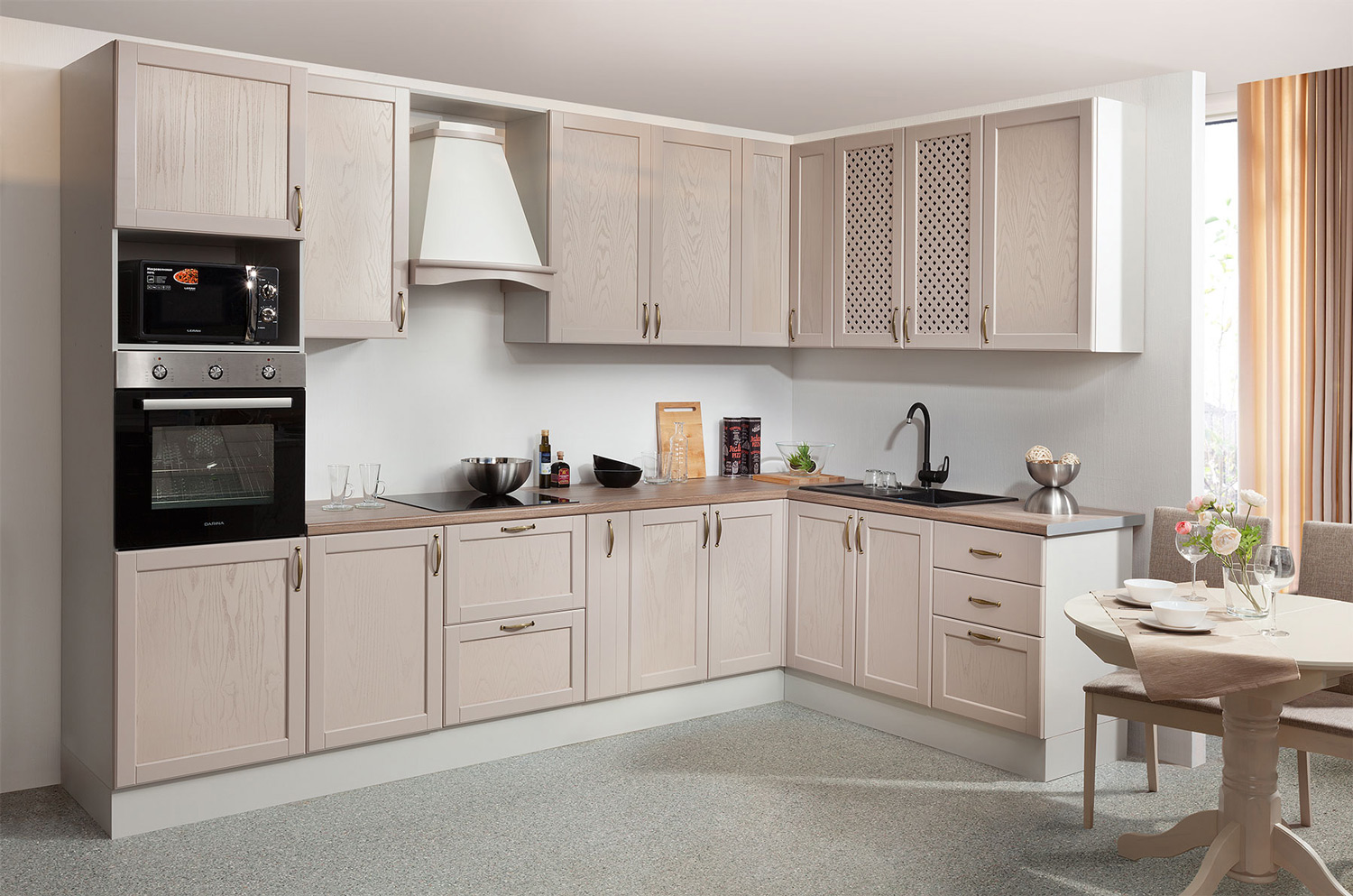Универсальный светло-серый цвет фасадов в тандеме с древесным оттенком столешницы.
