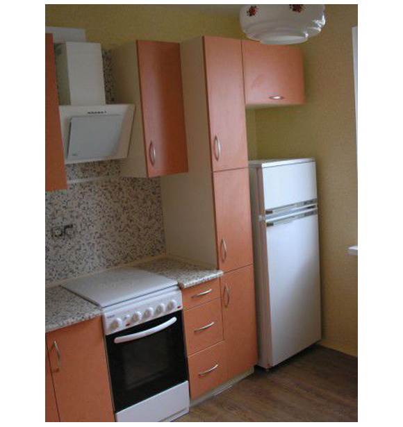Кухня изготовлена из качественного ЛДСП, при изготовлении используется только современная фурнитура. Высокая функциональность и вместительность обусловлена большим количеством модульных ящиков. Фасады окрашены в оранжевый цвет.