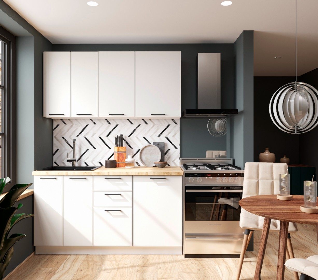 код 135486Универсальный светло-серый цвет фасадов в тандеме с древесным оттенком столешницы.