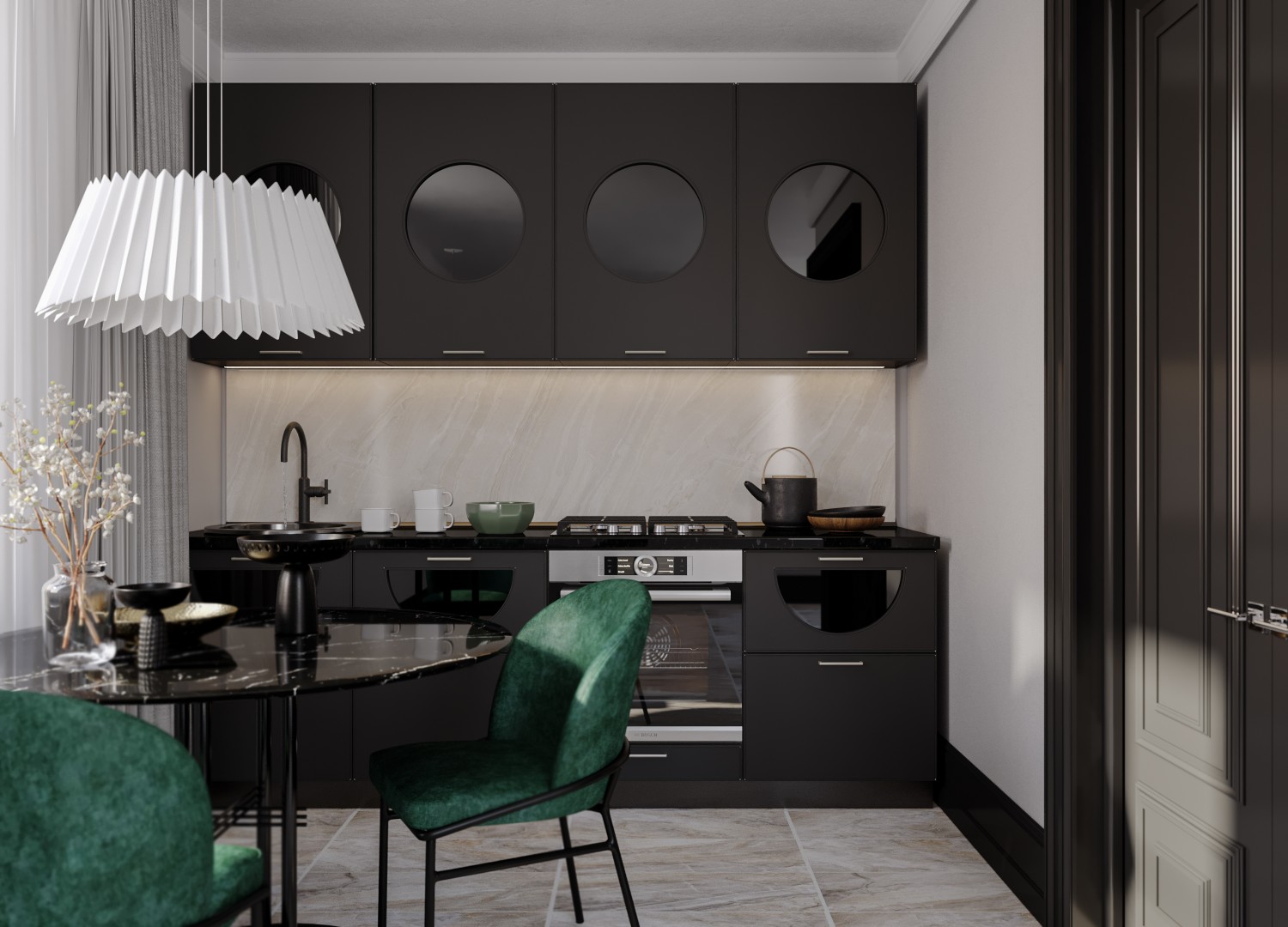 Мягкие линии фасадов. Черные глянцевые металлические ручки.