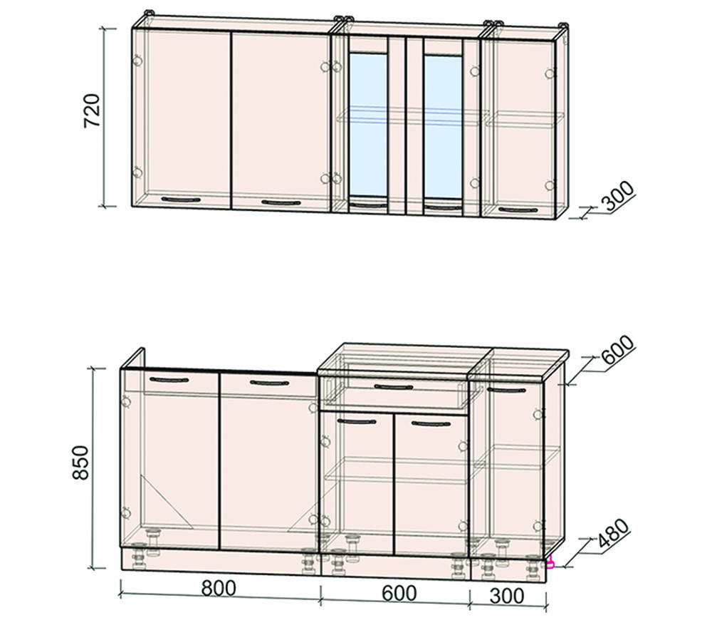 Высота навесных шкафов 72 см, напольных тумб – 85 см (со столешницей).