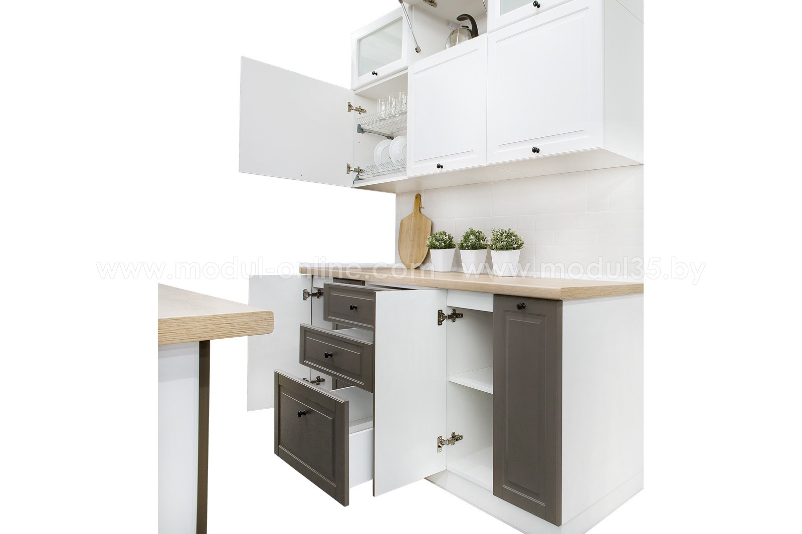 - Комплект поставки. Нижние и верхние кухонные модули, фасады (каждый в отдельной упаковке), цоколь, защитный профиль, столешница, пристенный плинтус + заглушки, сушка, ручки, соединительные планки.