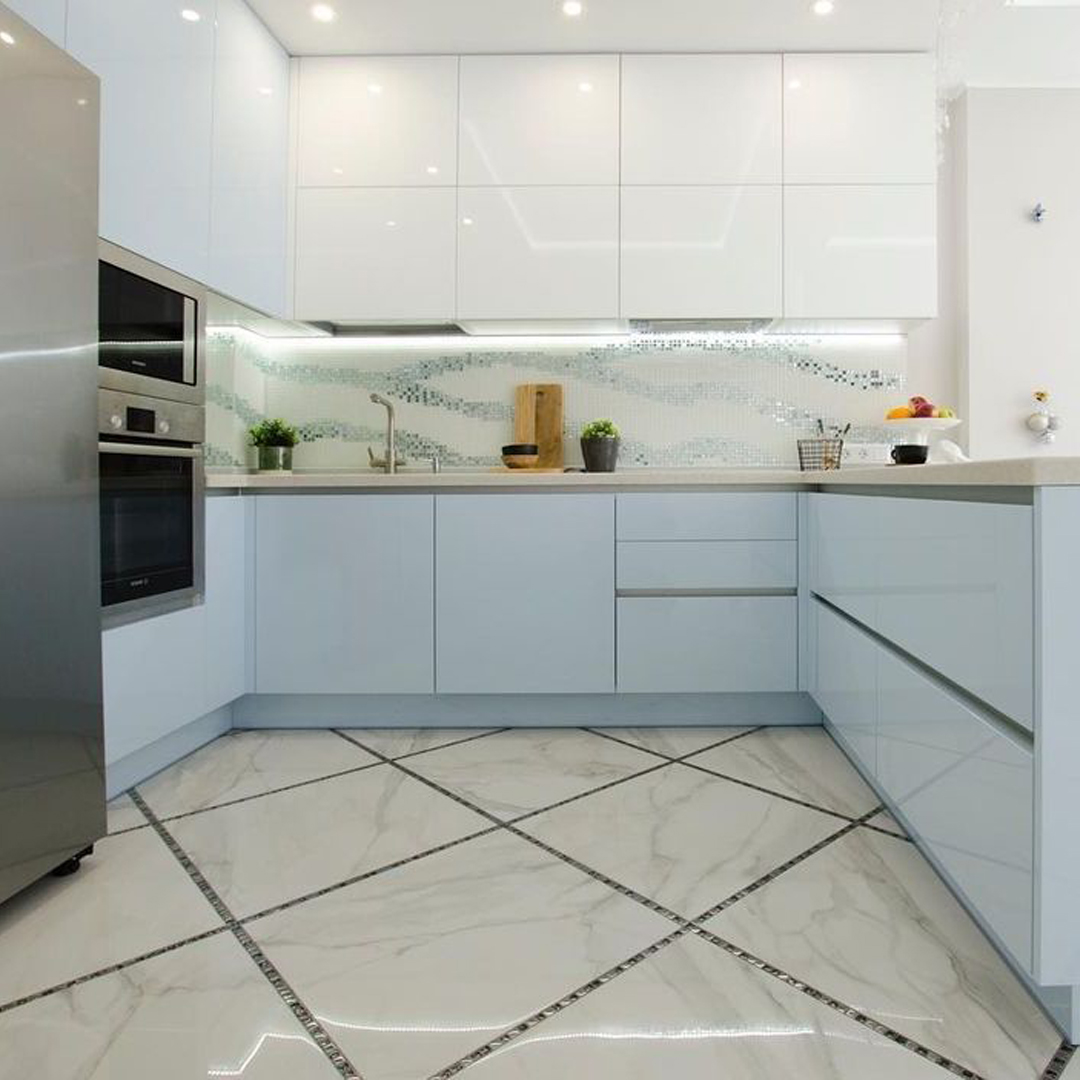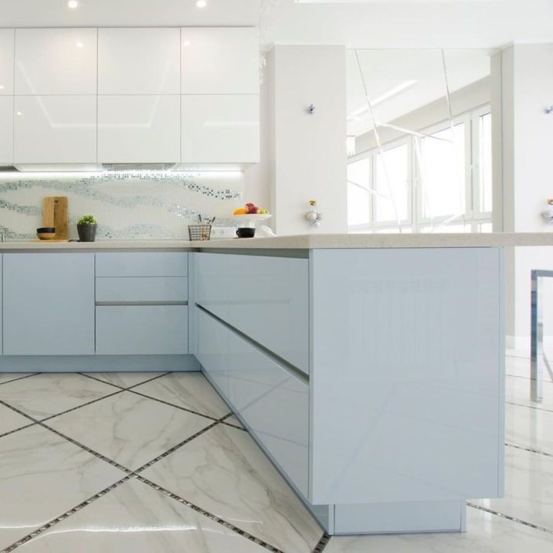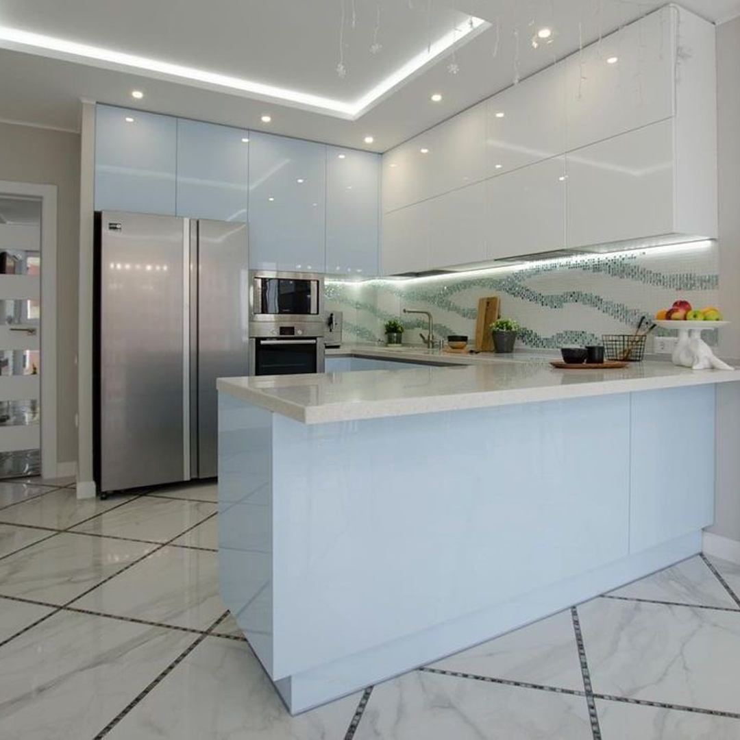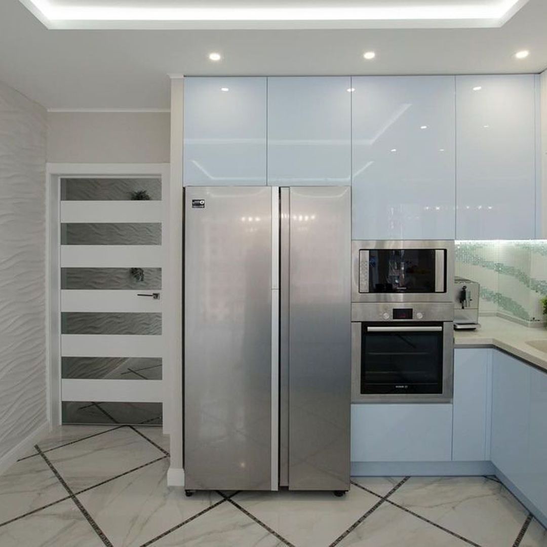 Однотонные матовые фасады с текстурой дерева, вставки из стекла.